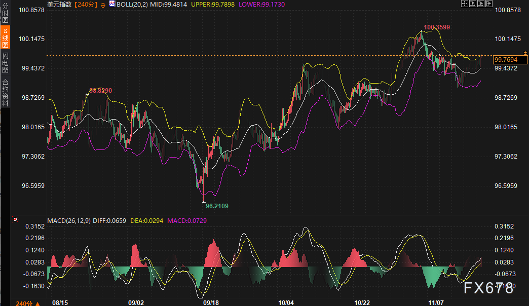 美元指数240分钟图显示,价格已站稳布林带中轨99.4813上方,上轨99.7882构成短期阻力,下轨99.1739为较强支撑。MACD虽仍处于负值区域(DIFF -0.0661,DEA 0.0295),但快慢线差距持续收窄,零轴金叉临近,技术形态支持短期偏强运行。