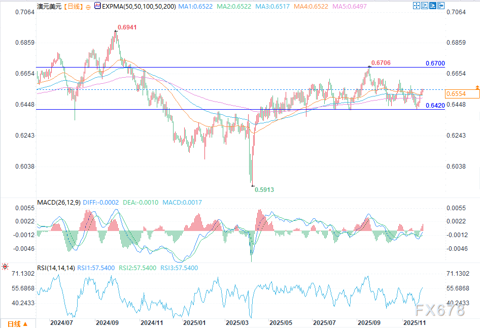 上周澳大利亚统计局(ABS)公布强劲通胀数据后,澳元/美元汇率延续上涨态势,最高触及0.6556,创下11月13日以来的新高,较上月低点0.6420显著回升。