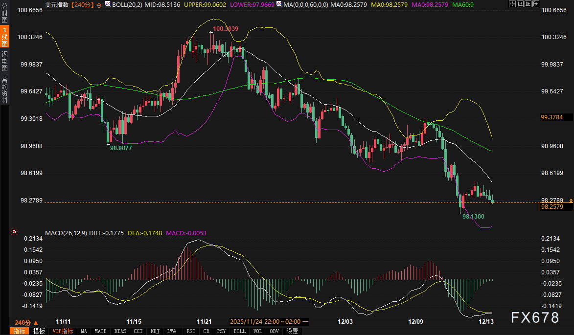 美元指数:支撑97.97(布林带下轨),阻力99.06(布林带上轨)